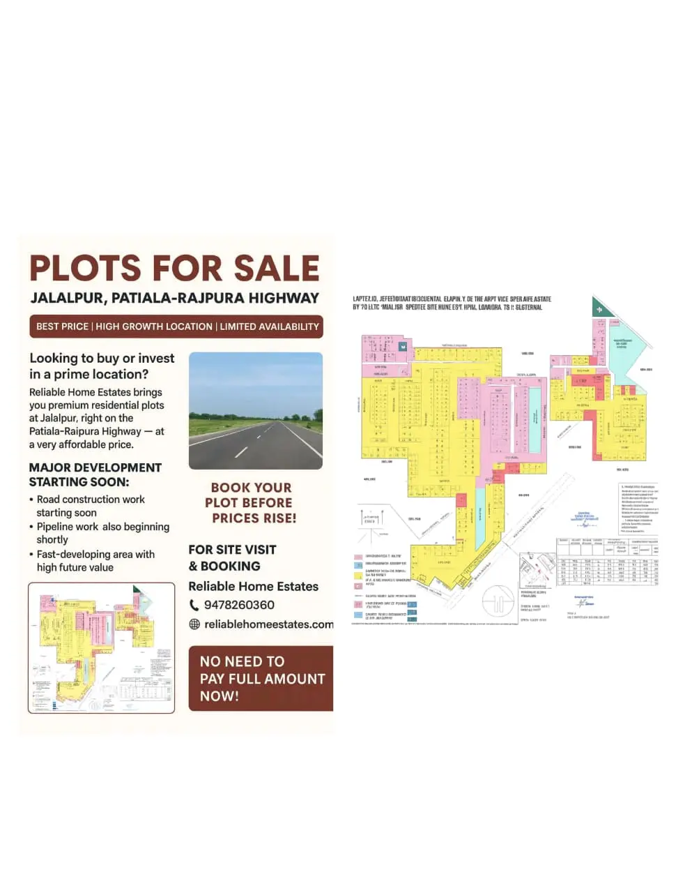 Premium residential plots are now available in Jalalpur on the Patiala–Rajpura Highway, offering an excellent opportunity for both buyers and investors. This rapidly developing location promises strong future value, with major work such as road construction and pipeline installation starting soon. With great connectivity, affordable pricing, and flexible payment options, these plots are ideal for building your dream home or securing a profitable investment. Book your plot today with Reliable Home Estates before prices rise.